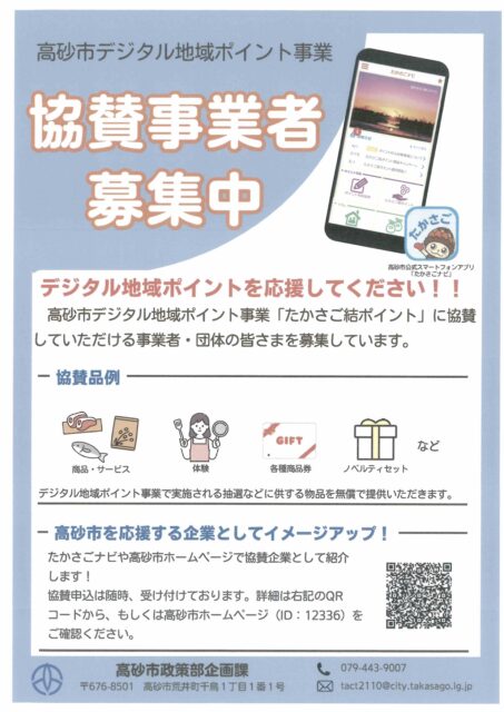 高砂市デジタル地域ポイント事業「たかさご結ポイント」に協賛していただける事業者・団体の皆さまを募集しています。